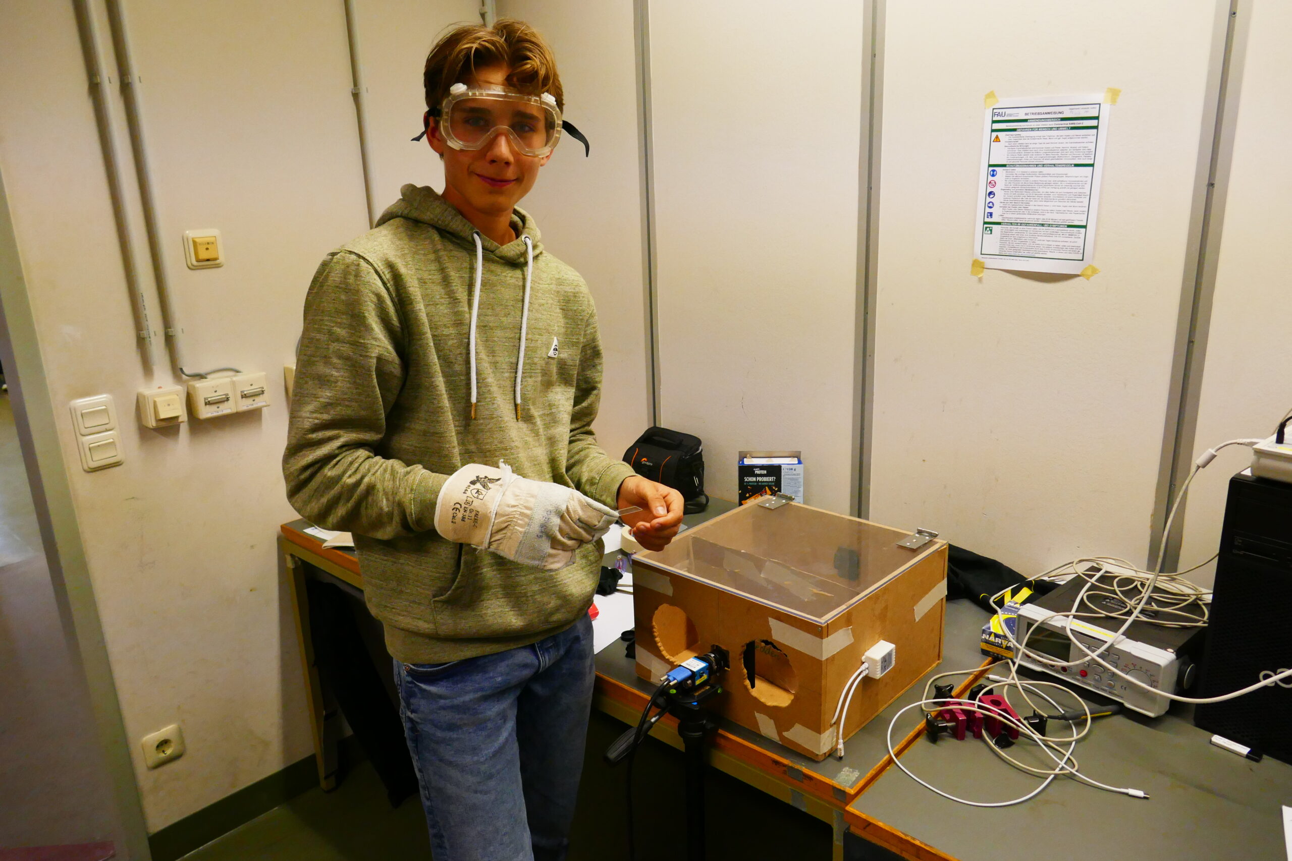In meinem Projekt benutze ich ein Polarimeter, um Spannungen in Glas sichtbar zu machen. Dazu mache ich erst Aufnahmen, wie das Glas bricht, um dann zu analysieren, wie die Lichtstärke, die man im berechneten Glas erkennt, sich unter steigender Passions- und Biegespannung verändert. Dadurch soll man dann bei Glasscheiben in beispielsweise Gebäuden erkennen können, ob das Material durch schwer berechenbare Effekte, wie das Setzen des Hauses im Fundament, unter Spannung steht und so die Gefahr eines Bruchs steigt. Beim ESFZ hatte ich die Möglichkeit, mit fortgeschritteneren Materialien als in der Schule zu arbeiten und meine Projekttage unter anderem durch eine elektronische Spannungsmessung zu erweitern.